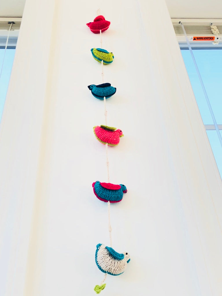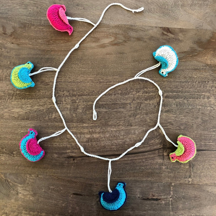 - Features a beautiful arrangement of pastel-colored birds and farm-themed accents, crocheted from 100% organic cotton.