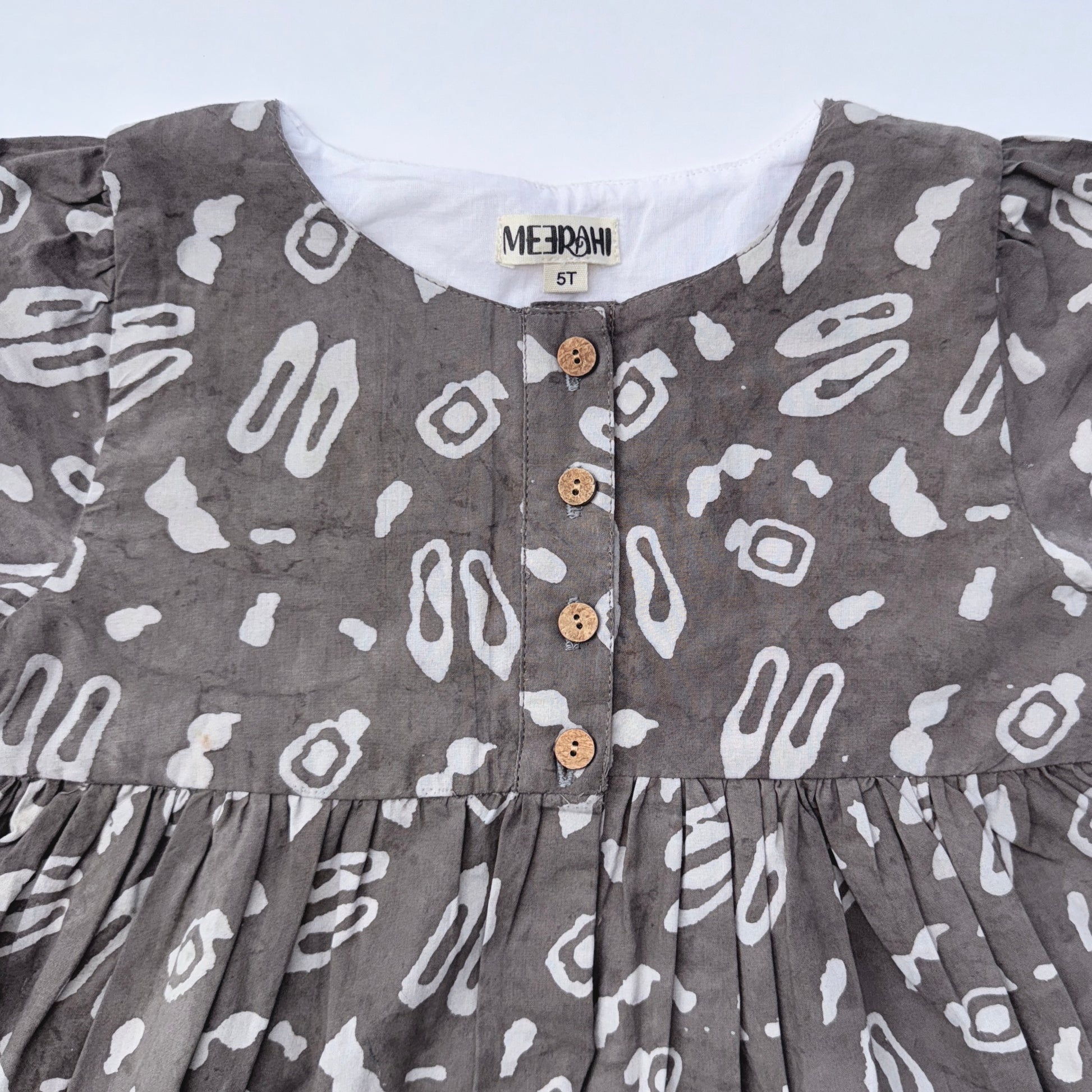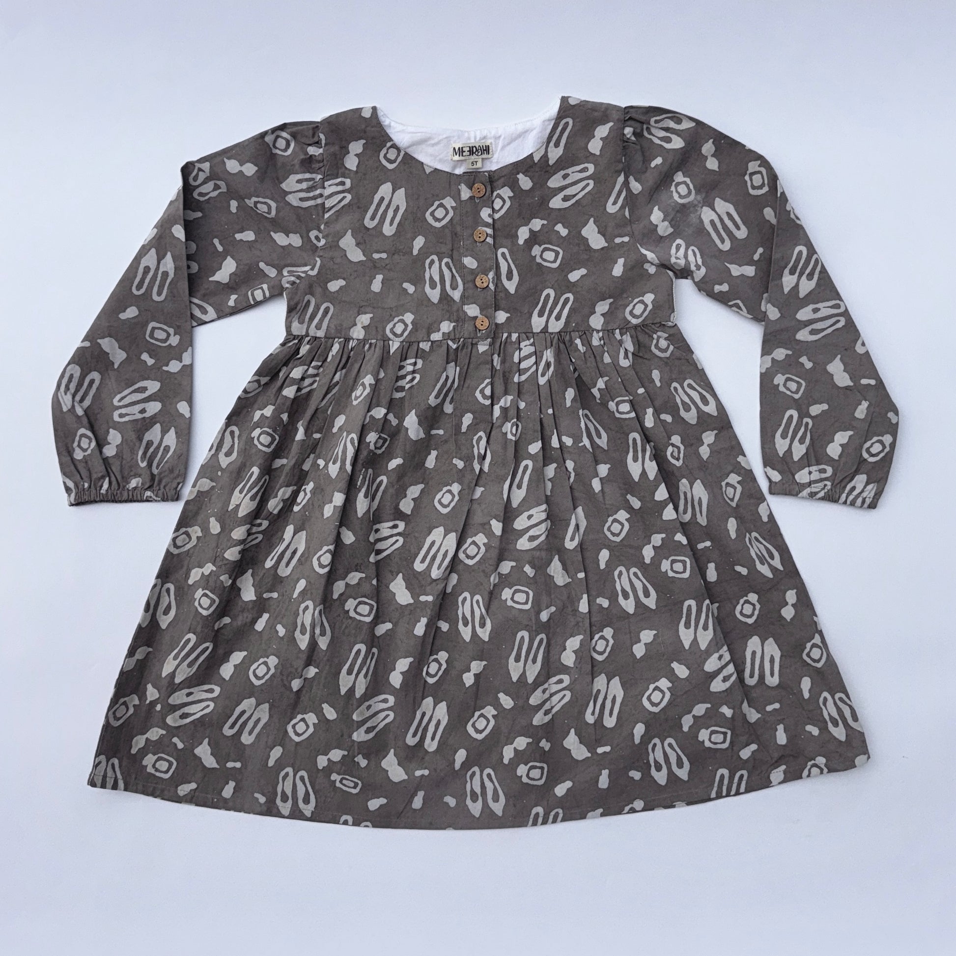 A rich brown dress featuring a charming slipper print, brought to life with a stretchable woven cotton back that adds comfort, character, and a touch of artisanal texture. A unique blend of playful design and timeless elegance.