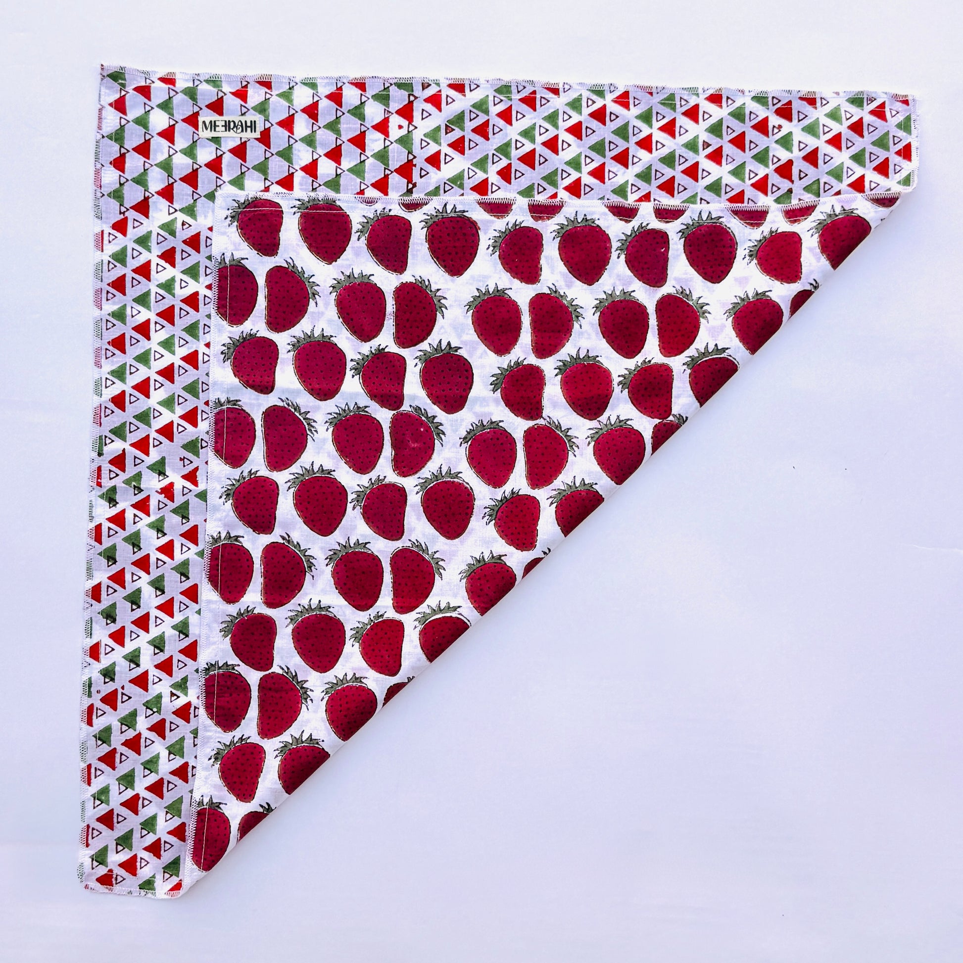 • Reversible dog scarf with red strawberry print on one side and holiday print on the other side.